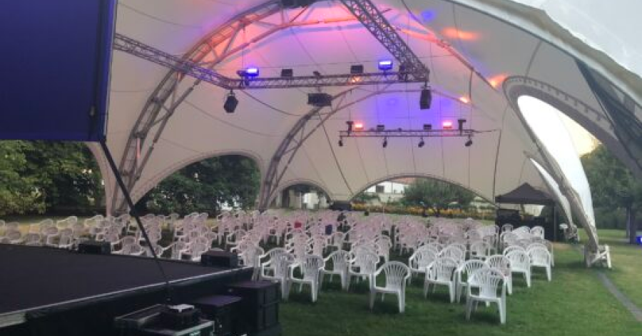 Sattes Grün, strahlender Sommer und eine pandemietaugliche Einrichtung eines tollen Zeltes für Podium und Auditorium – feste Plätze mit viel Rasen zwischen den Sitzen und trotzdem entsteht sofort dieses so vermisste Gemeinschaftsgefühl, dieses Zusammensein, was man nur in einer Veranstaltung oder einer Kinovorführung hat. Da gibt es eine Energie, eine Hinneigung aus Neugier, Interesse, Spannung, Erwartung, Vorfreude, die alle Anwesenden eint. Das ist wunderbar und ein einzigartiger Moment, der so niemals reproduzierbar ist, da sich Publikum, Stimmung, Anlass immer und immer unterscheiden. Nicht einmal beim Besuch von Richard Wagners Ring sind alle Abende unterschiedslos, obschon man (wahrscheinlich) immer neben den gleichen Mithörer*innen sitzt – schließlich kennt man sich über jede Stunde gediegenes Drama ein bisschen besser.
