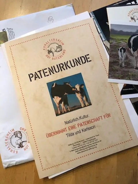 Liebe Tilda und lieber Karlsson, schön, dass wir Eure Paten sein dürfen! Wir freuen uns sehr, haben wir uns doch schon sooo lange eine kleine Kuh-Familie gewünscht – wir konnten einfach keine überreden, in die Stadt zu kommen… Nun hat es sich glücklich gefügt – Ihr habt ein feines Refugium auf dem Land und wir schauen Euch vom Schreibtisch aus beim Grasen, Sonnen und Ruhen zu. Danke, Hof Butenland für viel Engagement, Aufklärung und Information – und natürlich die höchst erfreuliche Post! „Mit dem Kuhaltersheim Hof Butenland haben wir einen Ort geschaffen, an dem die Kategorien Milchkuh, Mastkalb oder auch Versuchskuh durchbrochen werden und den Tieren das zurückgegeben wird, was ihr kostbarstes Gut ist: ihr Leben und ihre Freiheit. Denn die Orte, von denen sie stammen, haben kaum etwas mit Leben geschweige denn mit Freiheit und Frei-Sein zu tun. … Auf Hof Butenland leben inzwischen rund hundert Tiere unterschiedlicher Spezies, die meisten davon ehemalige Nutztiere, die dem Schlachter, dem Hunger- oder Kältetod oder der Verwahrlosung entkommen sind und nun bei uns ein soweit möglich freies und selbstbestimmtes Leben führen können.“